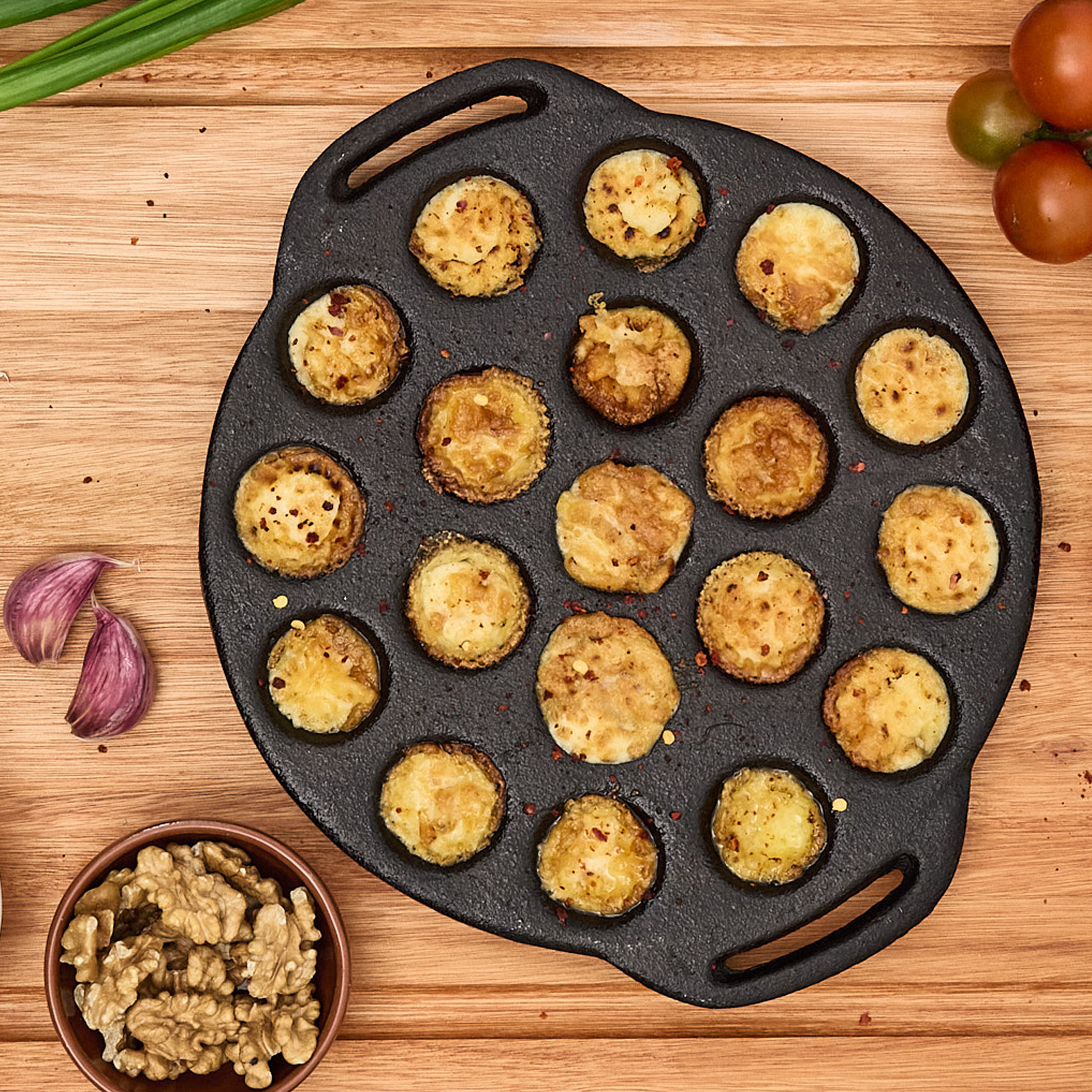 Incluye un plato de madera que no solo sirve como base estable, sino que también te permite sacar la provoletera del horno o parrilla y llevarla directamente a la mesa, manteniendo el estilo y la practicidad. Con 19 cavidades, es ideal para preparar porciones individuales de provoleta derretida, listas para disfrutar.